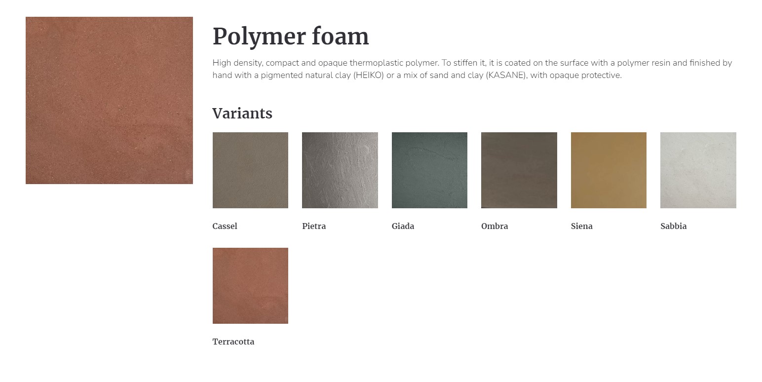 불투명한 보호막과 함께 착색된 천연 점토(HEIKO) 또는 모래와 점토의 혼합 (KASANE) 물질로 최종 마무리는 핸드메이드로 터치하여 마감합니다.