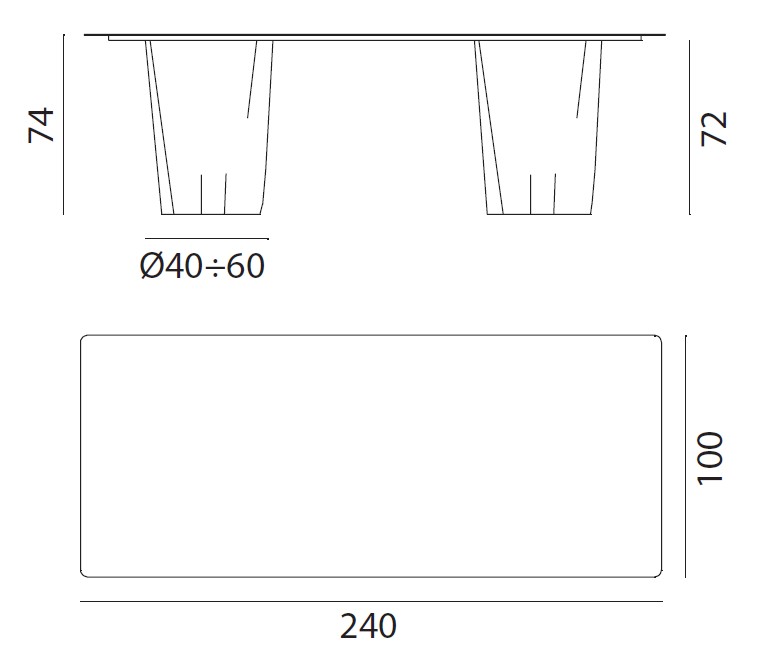 top in waxed iron plate, 240 x 100 cm, thickness 4 mm.