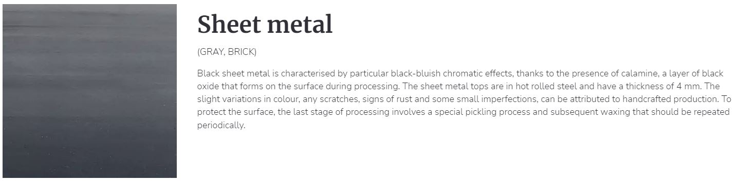 | IRON PLATE 아이언 플레이트 테이블 탑 소재인 아이언 플레이트는 두께 4 mm의 열연강판으로 완전한 “핸드 메이드” 제품이므로 다양한 컬러 쉐이드, 스크래치, 얼룩, 녹자국 등이 있을 수 있습니다. 상판 표면을 보호하고, 스틸 제품에 전형적인 녹 자국의 확대를 방지하기 위해서 본 제품의 마지막 단계에서는 스페셜 픽클링 및 왁스처리가 포함되는데, 이 과정은 구매 후에도 주기적으로 반복되어야 하며, 반드시 부드러운 마른 수건을 사용하여 왁스로 닦아 주실 것을 권장합니다. |