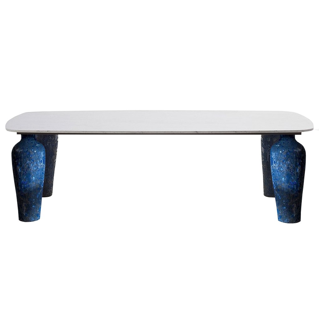 Table, white Carrara marble top 20 mm. Legs in blue ceramic.