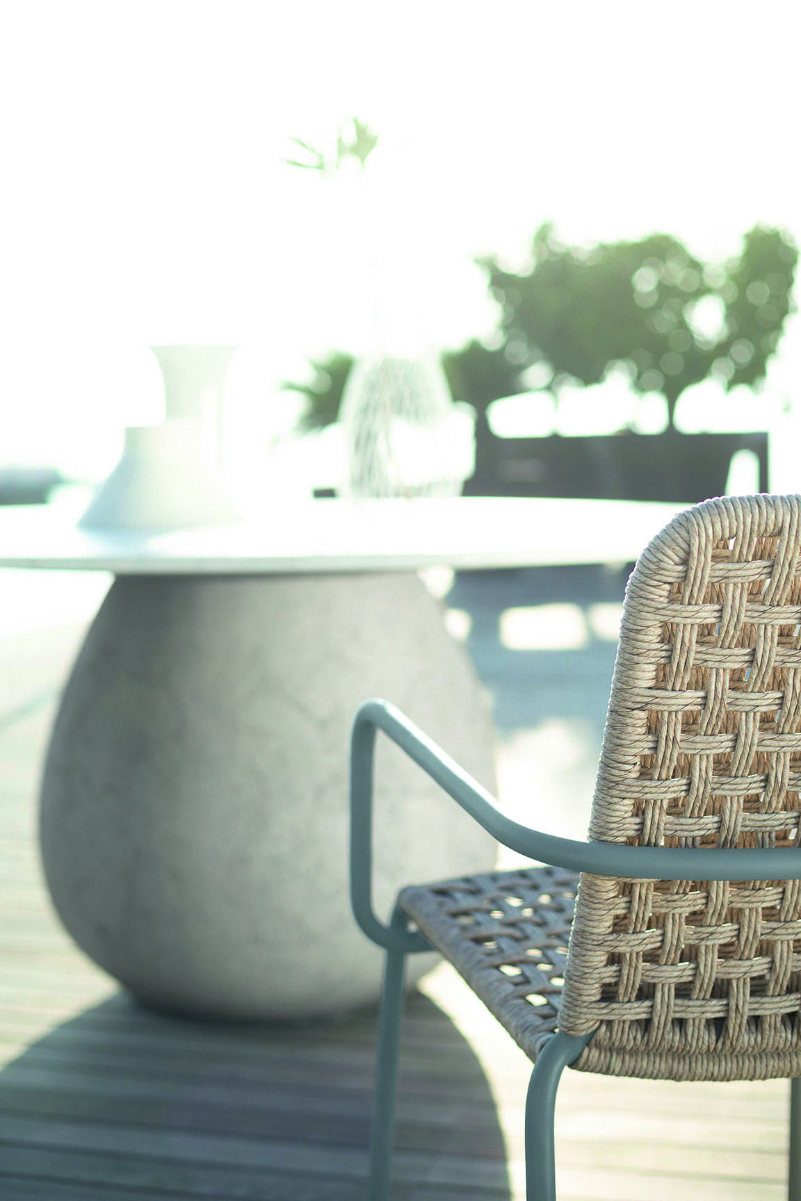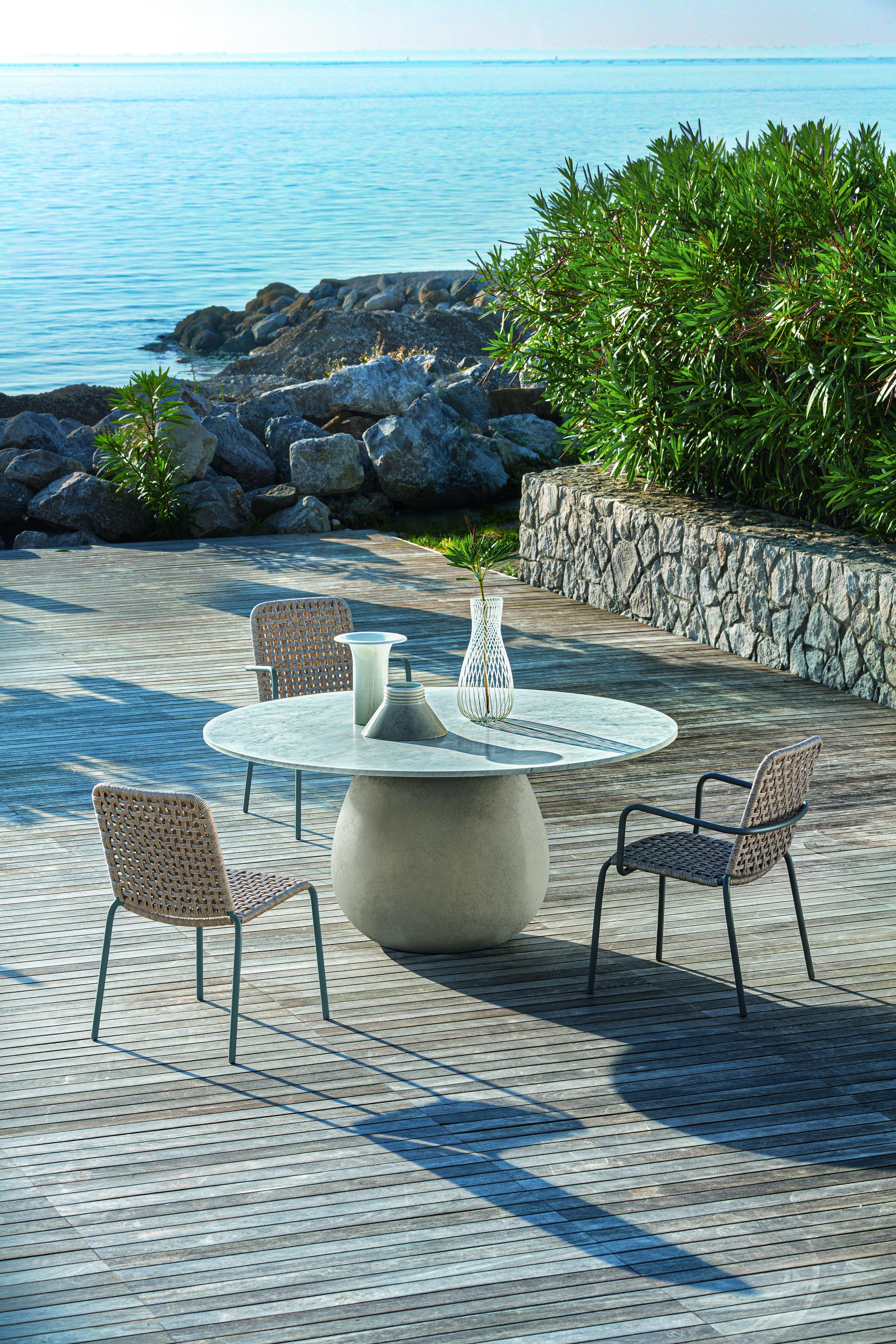 Round table, central GFRC concrete base. Top in white Carrara marble.