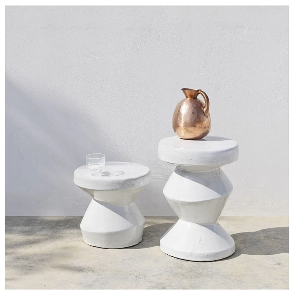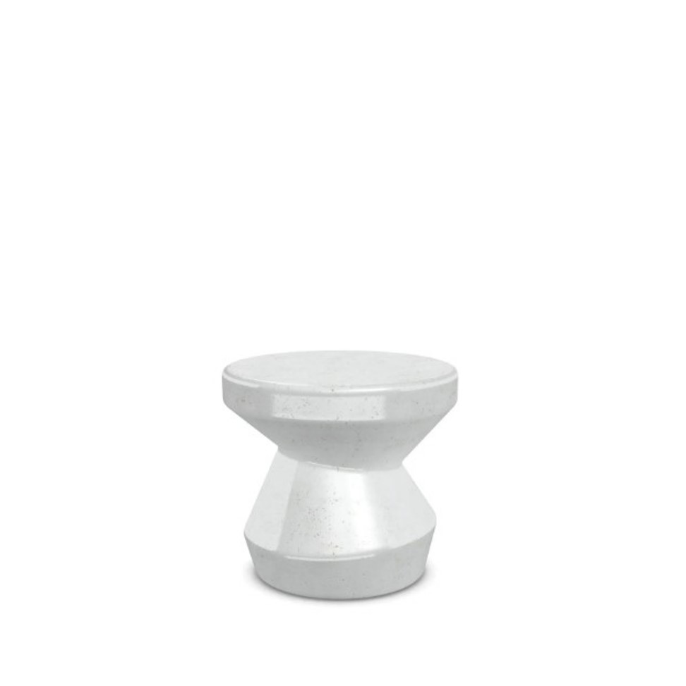 라운드 사이드테이블 겸 오토만, GFRC 콘크리트 소재의 핸드메이드 질감이 돋보이는 화이트 또는 앤트러사이트 그레이 컬러 옵션.