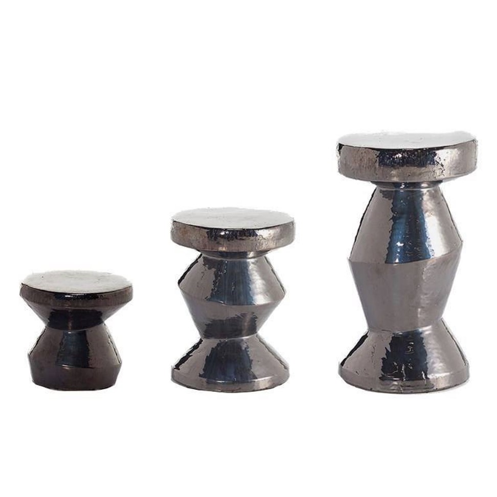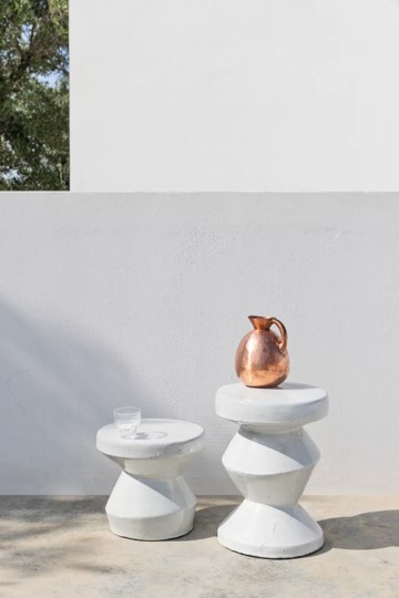 라운드 사이드테이블 겸 오토만, GFRC 콘크리트 소재의 핸드메이드 질감이 돋보이는 화이트 또는 앤트러사이트 그레이 컬러 옵션.