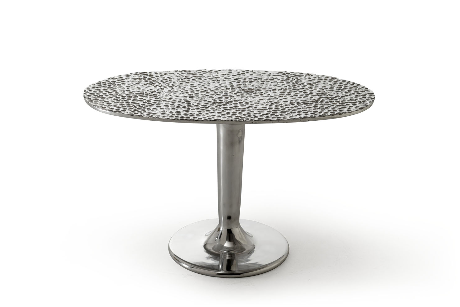 투명 라커 및 핸드 브러쉬드 공법으로 광마감을 낸 알루미늄 커피 테이블. 헤머로 두들긴 자연스러운 질감이 돋보이는 알루미늄 헤머드 탑